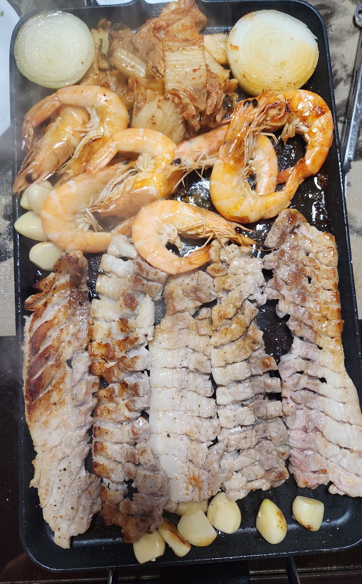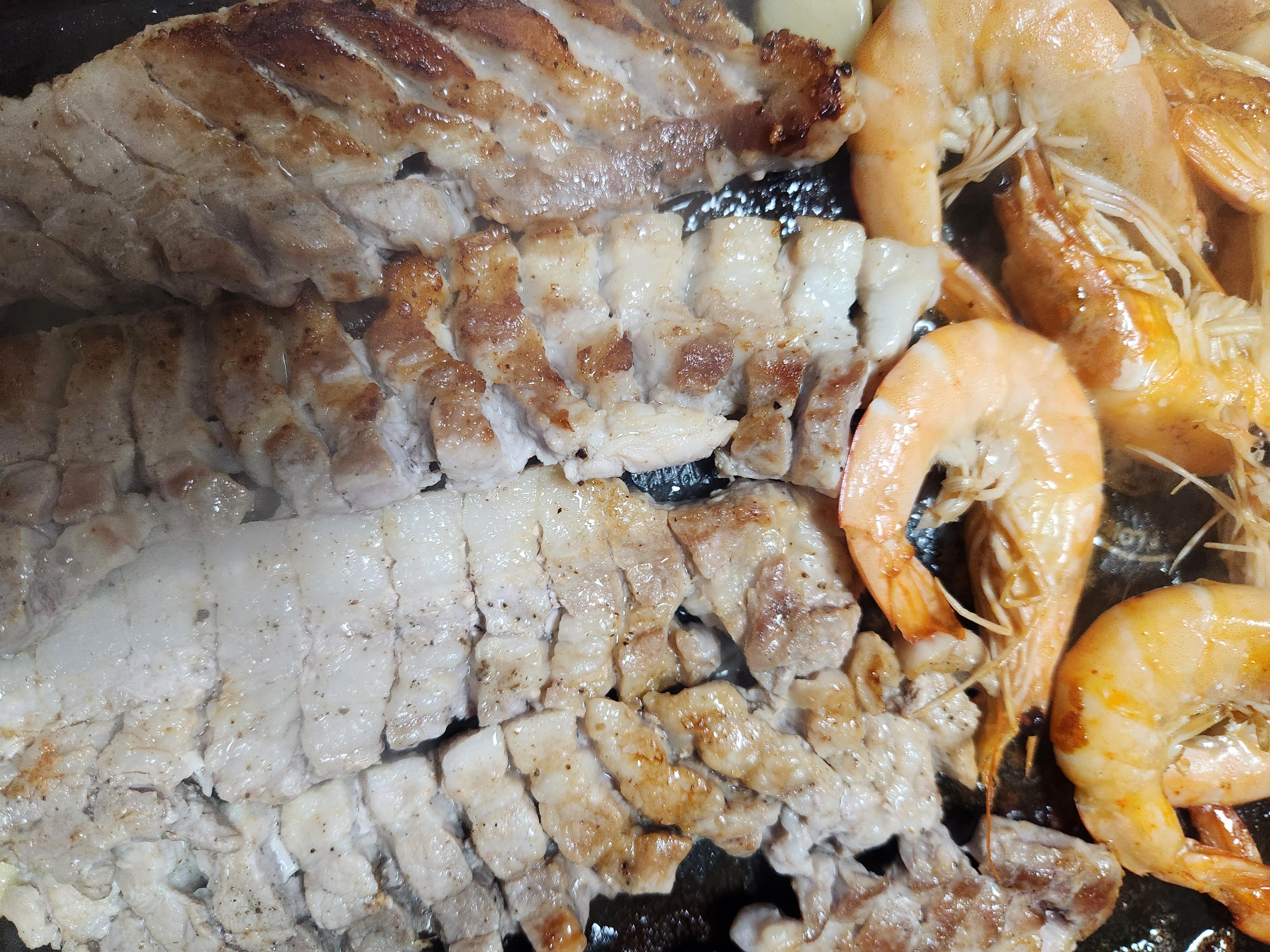 삼겹살기름에 구울만한 마트에서 새우를 사오고