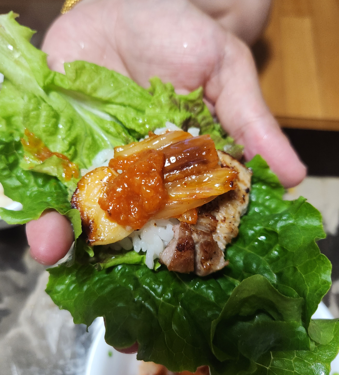 상추쌈에 올려진 고기한점